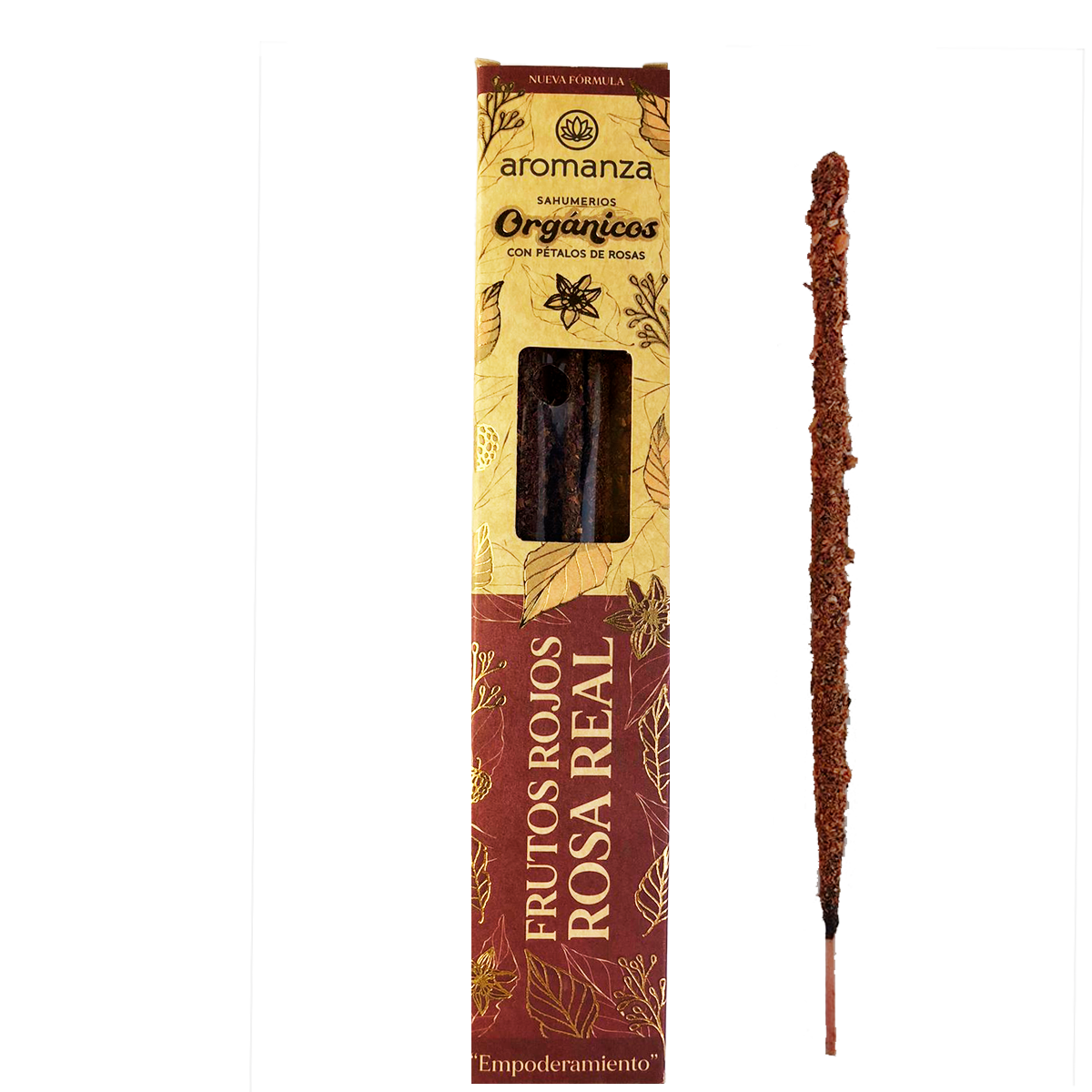 El Sahumerio natural, infusionado con esencias de frutos rojos y pétalos de rosas, libera una fragancia embriagadora que empodera los sentidos.